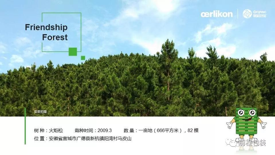 歐瑞康(Wuxi)與前程公司的友誼林位于安徽省廣德市前程?hào)|盛生態(tài)林業(yè)有限公司的林場(chǎng)內(nèi),林場(chǎng)現(xiàn)有土地總面積3000多畝,林場(chǎng)內(nèi)有松樹林、竹林、水庫(kù)、茶園、山核桃園等;友誼林占地面積為一畝地(666平方米),82棵松樹,品種為火炬松,寓意著雙方的合作擁有更加美好的明天。