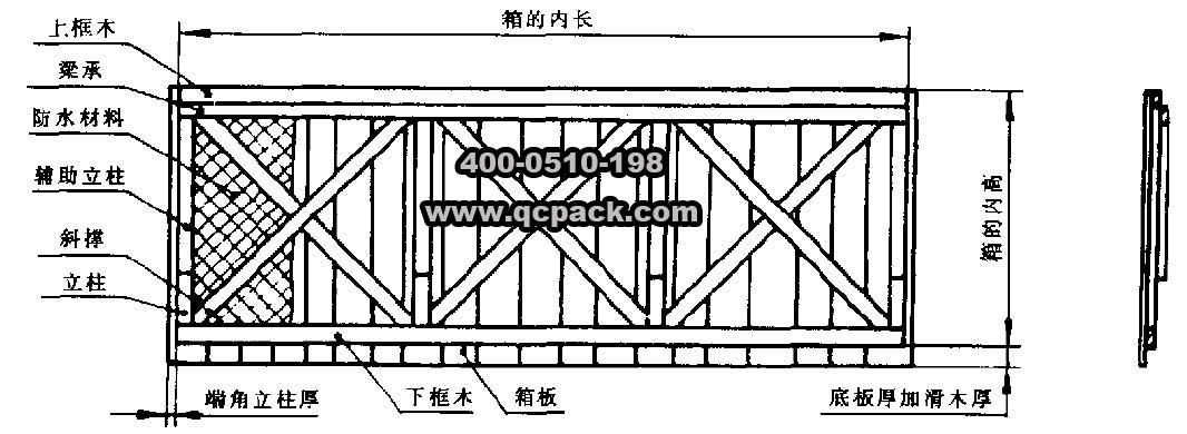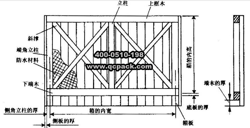 框架木箱的側(cè)面(圖6-3)和端面(圖6-4)是由框架、箱板、輔助立柱和梁承組成的。框架就是通常所講的桁架,它的構(gòu)件有上框木、下框木、立柱和斜撐,較大的框架在上框木與下框木之間還設(shè)有平撐。